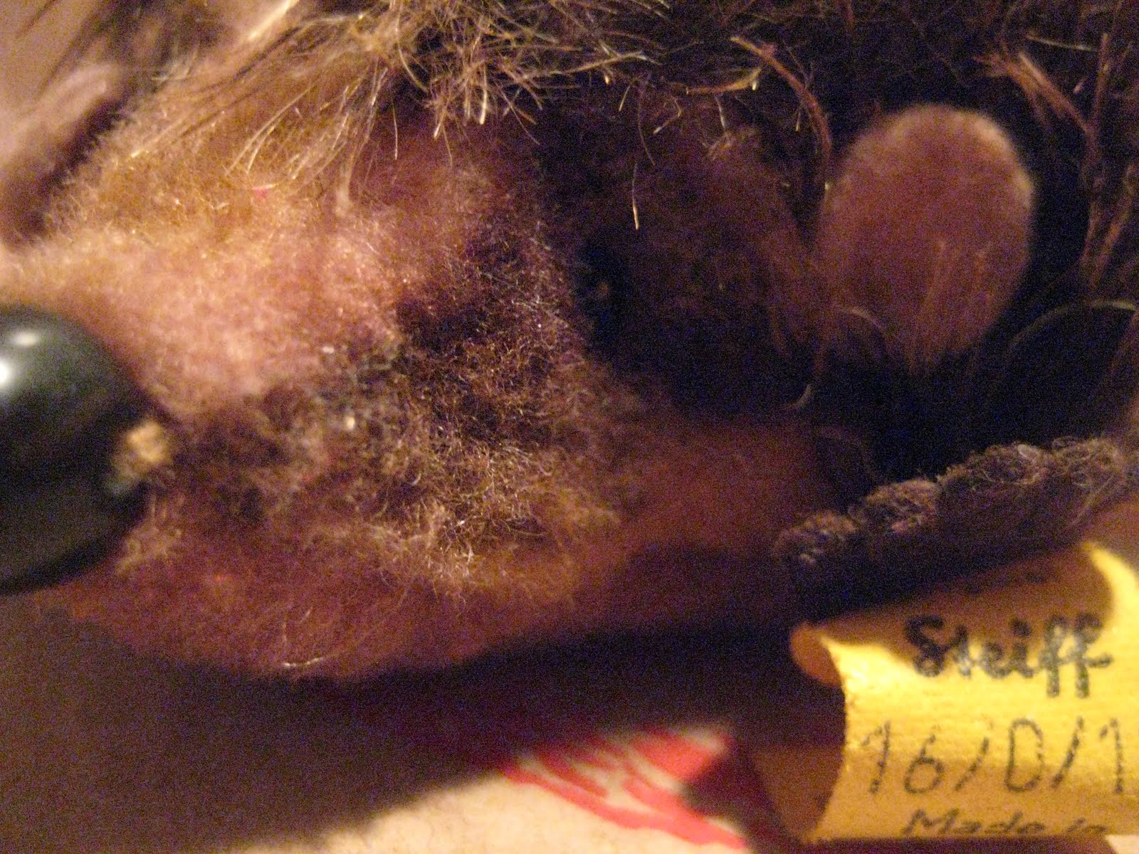 Let’s shine a little light on Eryka’s nocturnal buddy. What you have here is what Steiff calls Joggi Igel or Joggi Hedgehog. He is made from spiky “tipped” (meaning that the fiber ends are dyed a different color than the entire length of the fiber) mohair, in a lying position, and has a flat bottom. His sweet tiny face, ears, paws, and underside are made from grey felt. This particular Joggi was made in 6, 10, and 17 cm from 1966 through 2002. Eryka’s Joggi, number 1670/10, dates him in the 1968 to 1985 production period.